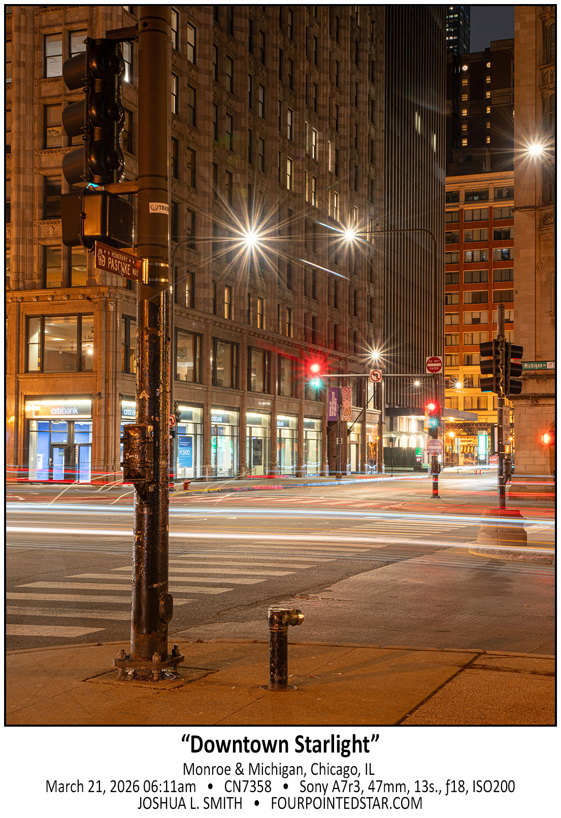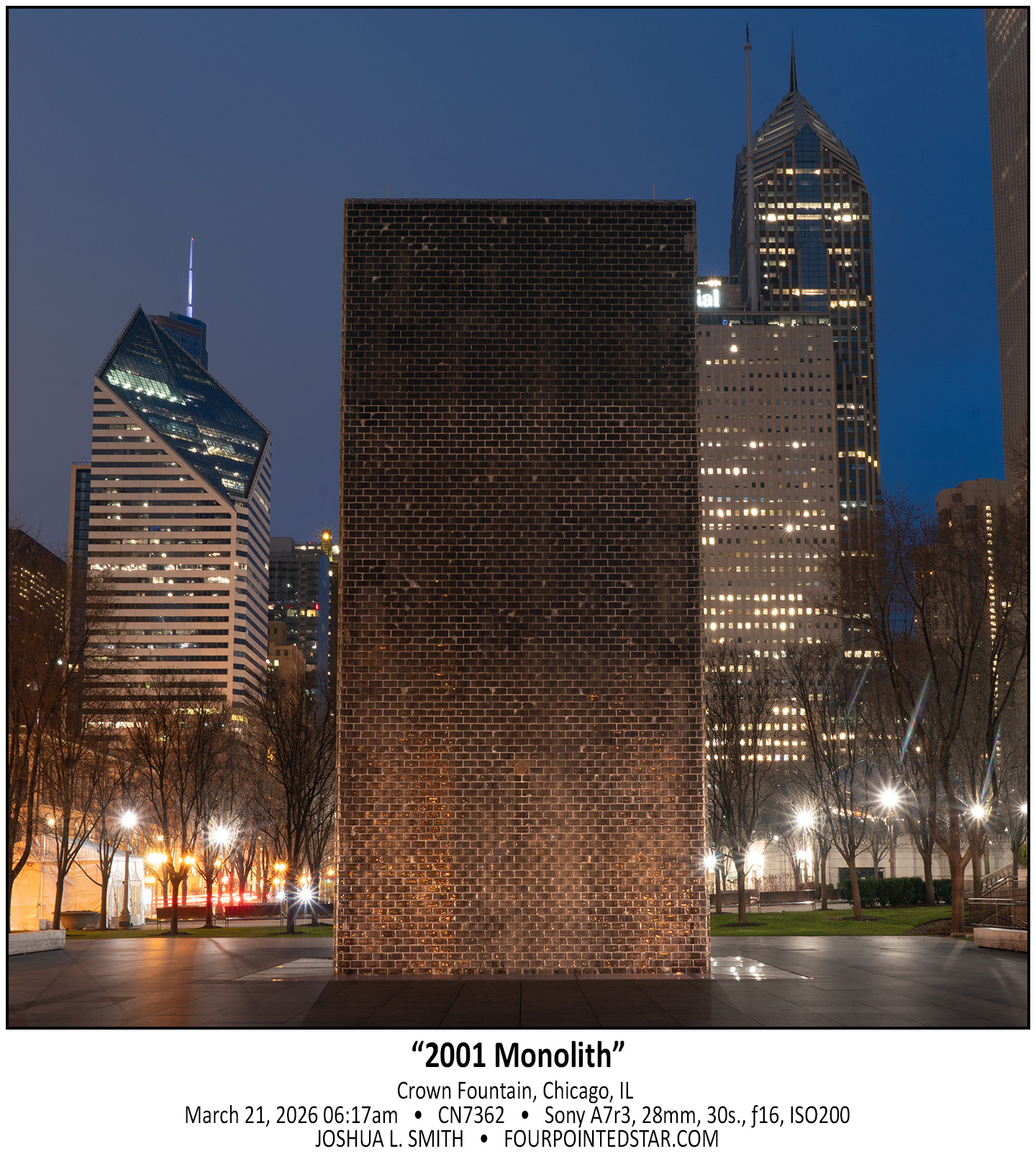 This spring, Chicago Henge was on a weekend, so I got up at 4am to head downtown to capture the sunrise; sadly this glow was the most that Mother Nature cooperated.  When I arrived downtown, it was pretty obvious that the sky would remain overcast, so I created other images instead and ended up with 3 pairs of photos that I like.