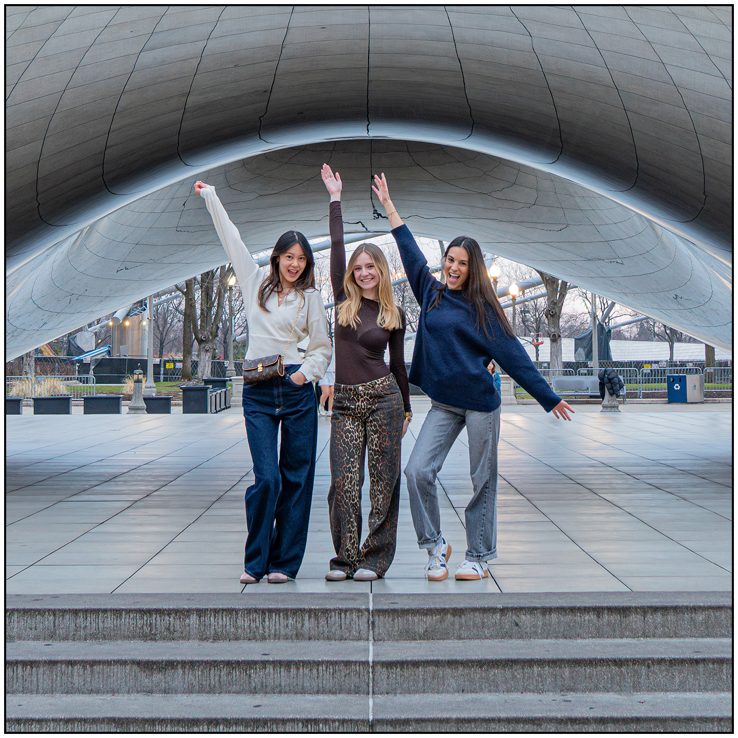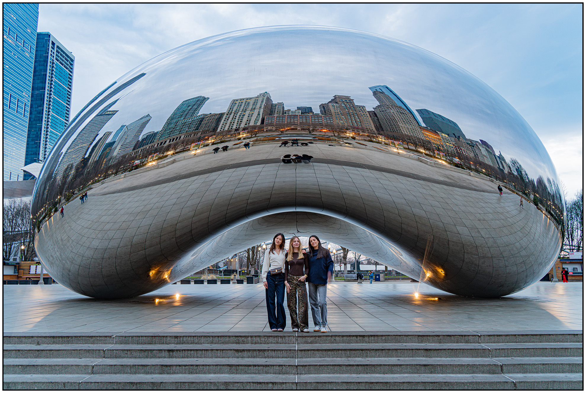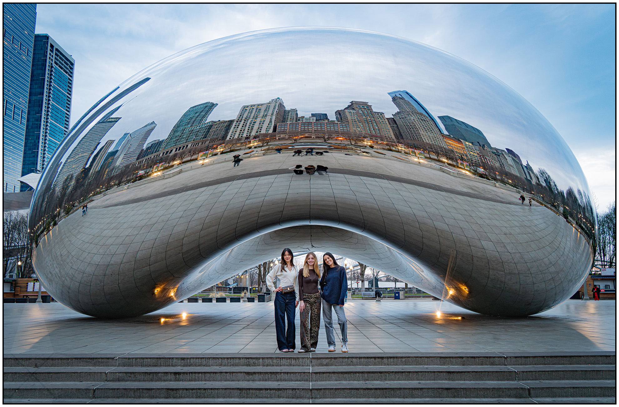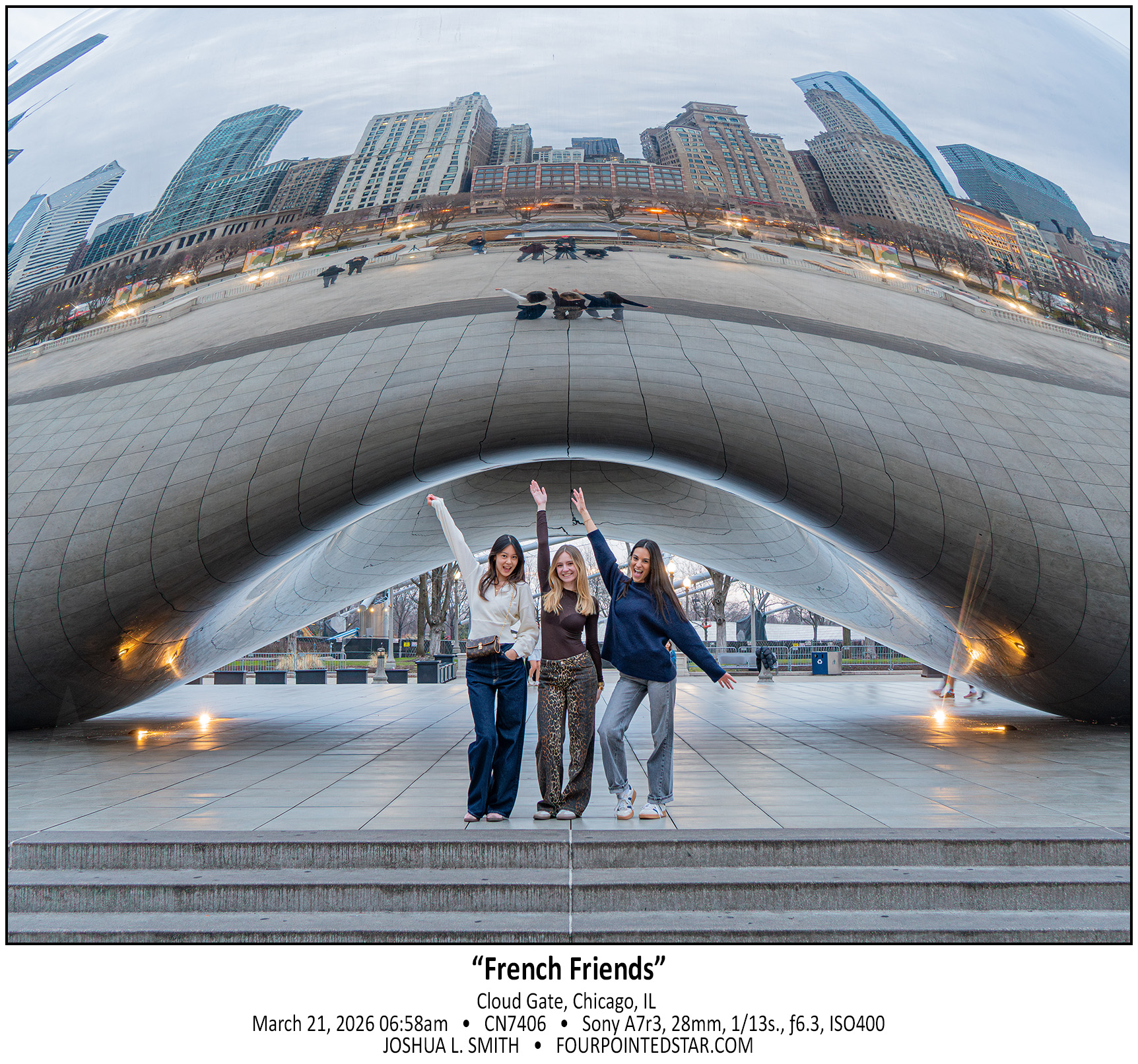 As I waited for the sun to rise, a few photographers arrived with the same idea – Chicago Henge under the Bean.  As we waited, we all came to the same realization, that this photo was not going to materialize.  There were quite a few tourists wandering around by 7am, so when I saw these three younger girls come by, I asked them if they would pose for us for a few photos; they happily obliged.