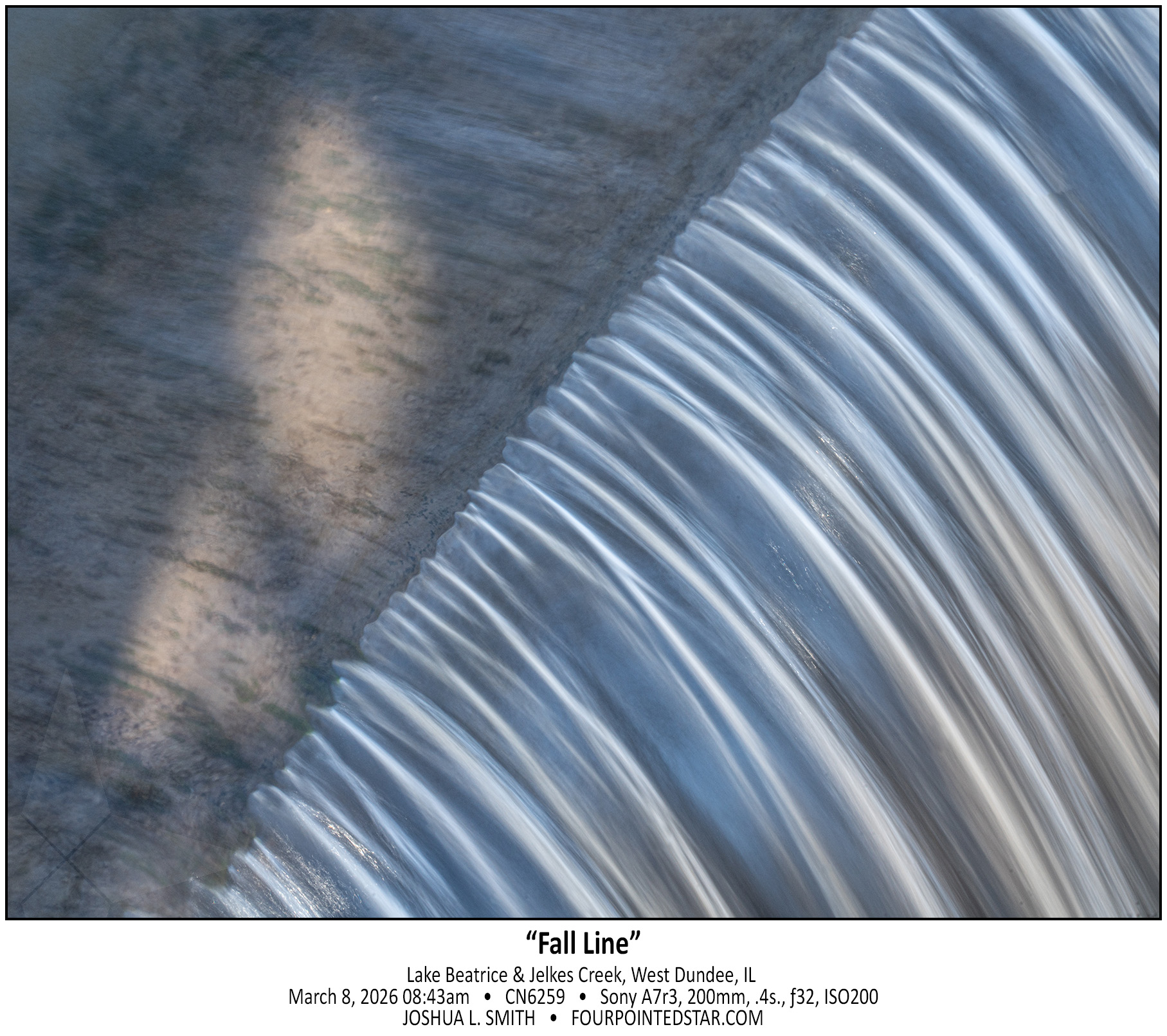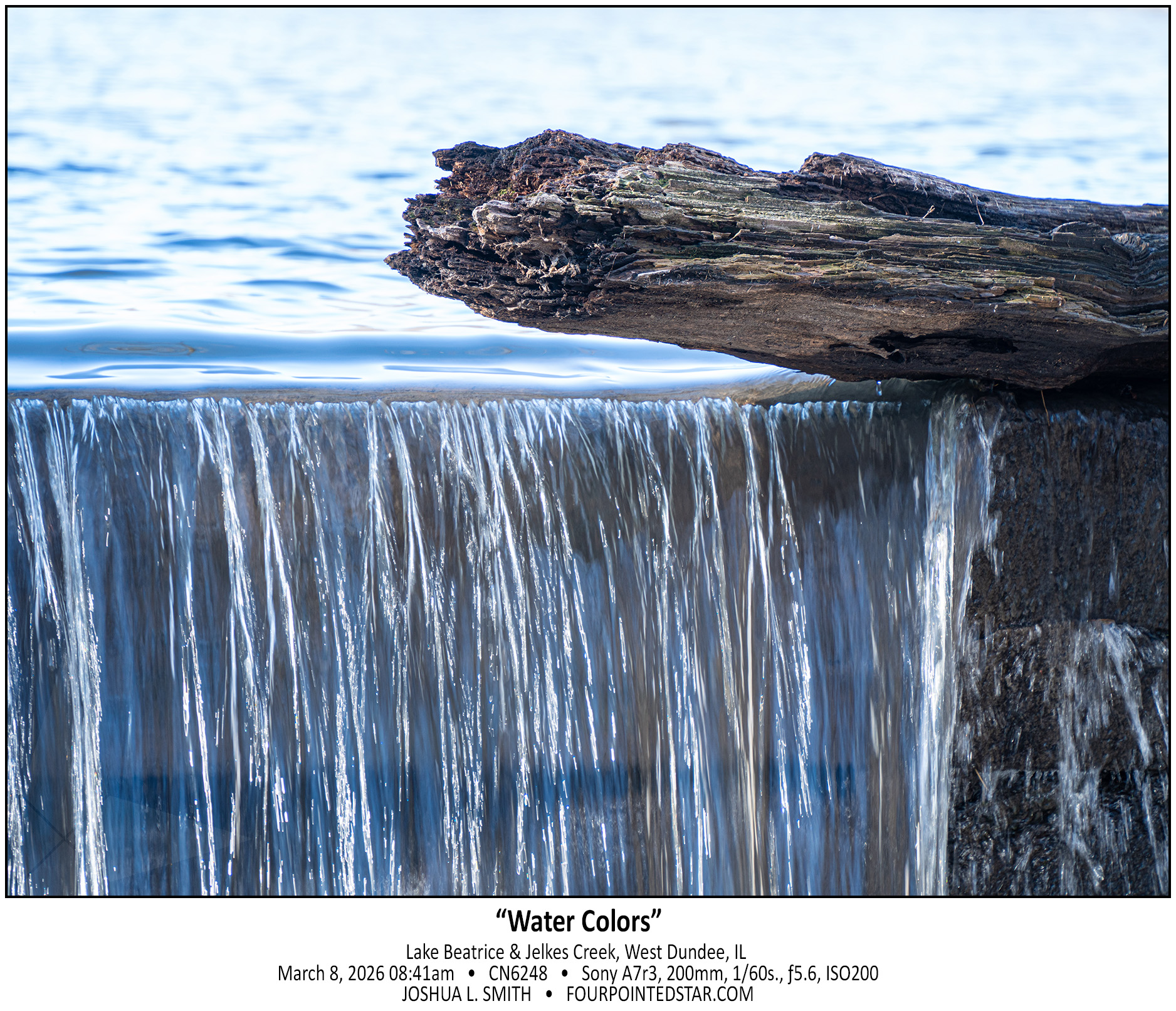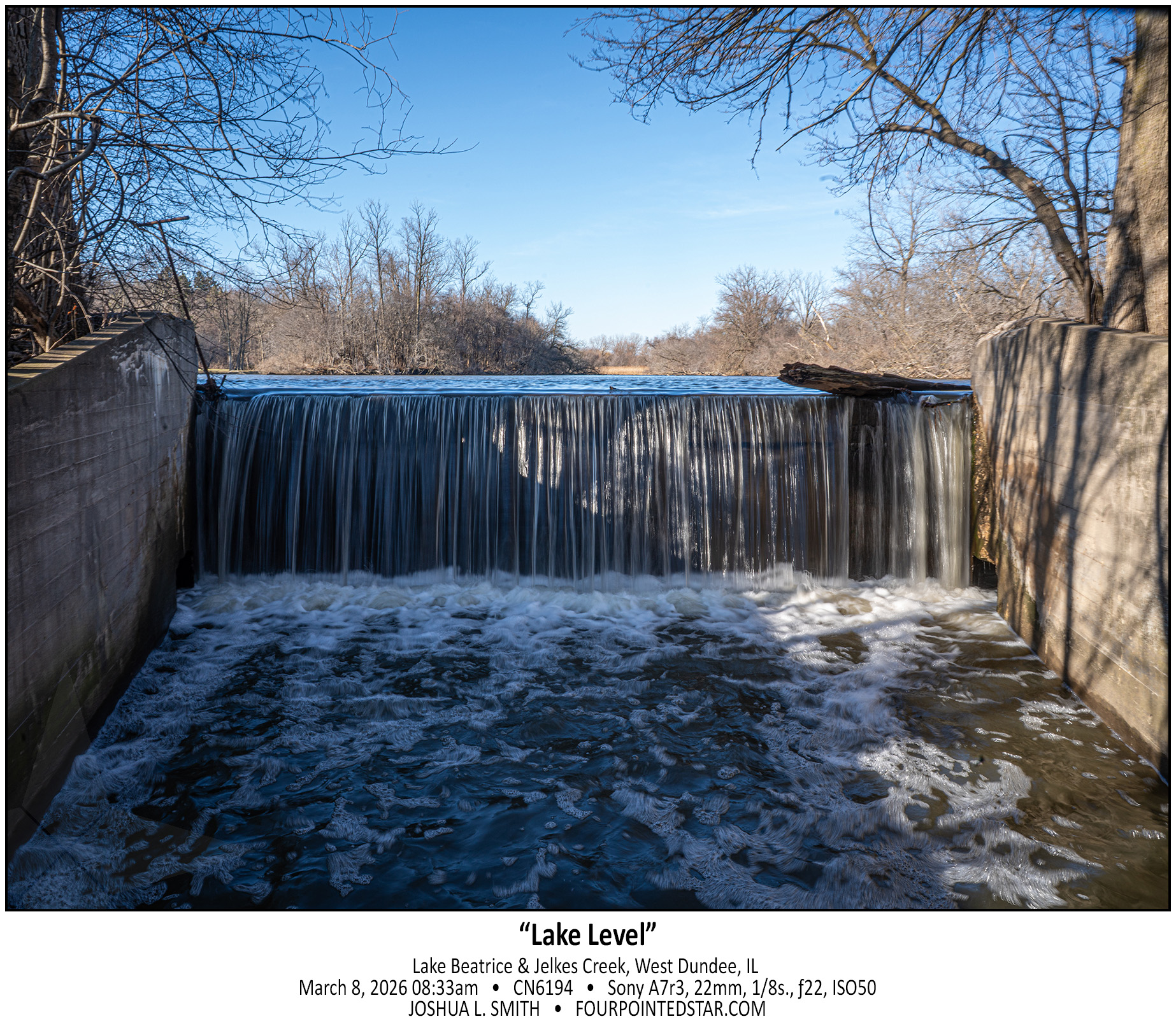 What makes a waterfall a “waterfall”? Jelkes Creek doesn’t have enough elevation change to create a falls through its meandering path in Sleepy Hollow and Dundee Township to create much besides bogs and marshes. I would guess that this damn & spillway were created as a control point for Jelkes Creek as it flows under Hwy 31. What I find most interesting is that I’ve driven by Lake Beatrice for over 15 years and missed that this spillway existed the entire time.